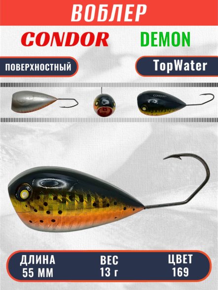 ➤ Какие характеристики у товара "Воблер Condor поппер хорватское яйцо Demon 55 размер 55 мм вес 13.0 гр поверхностный, цвет 169"?
