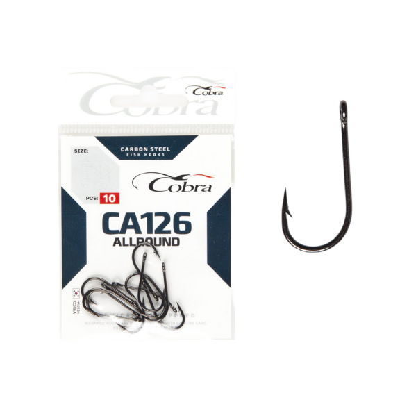 Направленное практически параллельно прямому цевью недлинное жало – особенность одинарников с индексом CA126. Такая геометрия в совокупности с химической заточкой обеспечивают высокую проникающую способность и хорошую засекаемость. Аккуратная бородка помогает удержанию клюнувшей добычи. Изготовлены крючки Cobra серии Allround CA126 из прочной углеродистой стали, что позволяет бороться с норовистой добычей. Имеют ушко-колечко, что позволяет крепить одинарники к монофильной и плетеной леске. Серия рассчитана на поплавочную ловлю. Подходит для не очень крупных растительных и животных насадок.