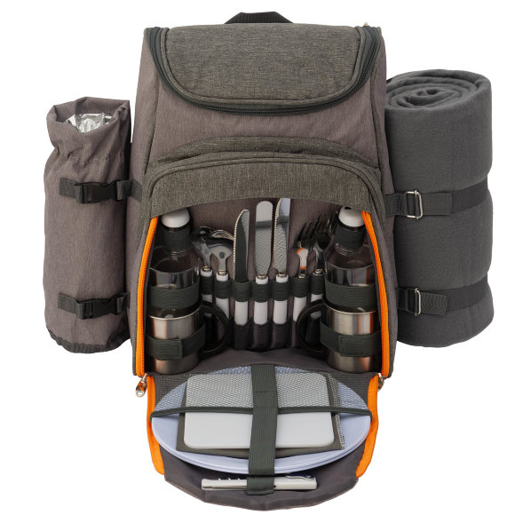 Идеальная сумка для пикника на 4 персоны! В наборе: 2 солонки, 6 металлических кружек, 1 штопор открывашка, 1 разделочная доска, 1 полотенце, 6 металлических тарелок, 2 ложки, 2 ножа, 2 вилки. Характеристики: Размеры - 44х24х32 Вес - 2,1 кг. Материал - 600 D Polyester.